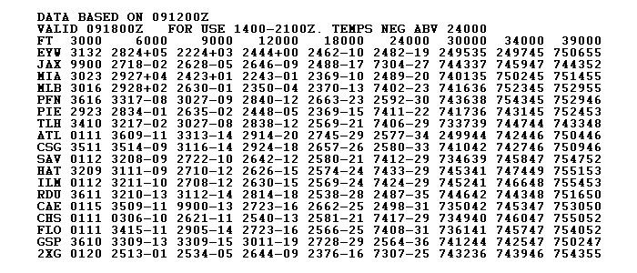 (Note that all temperatures above 24,000 feet are negative. The minus sign is not used. The outside air temperature at 30,000 feet over Key West, for example, is negative 35 degrees Celsius. The wind is blowing from 240 degrees at 95 knots there.)