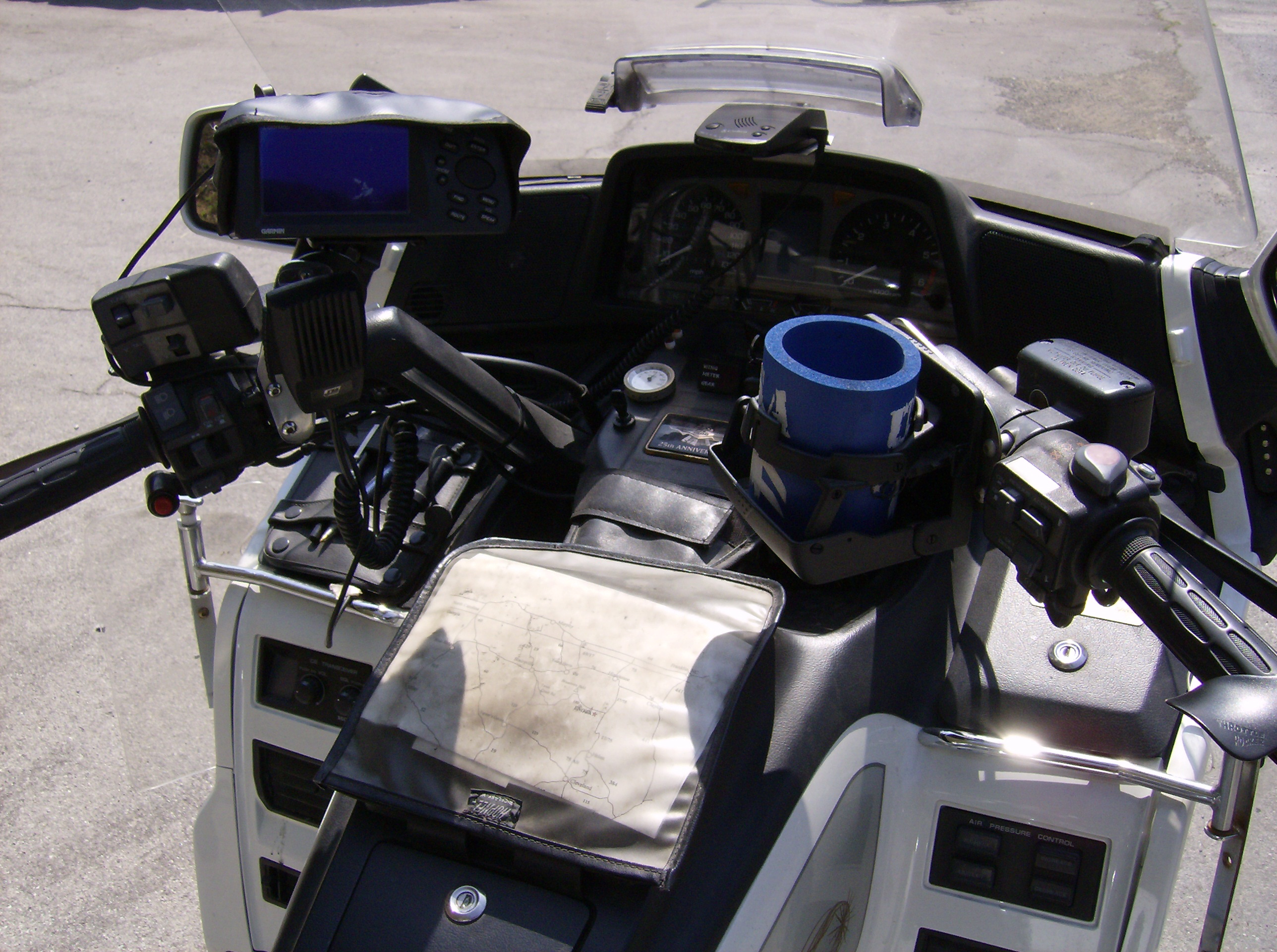 Coming around a corner a little further up US 129, I passed a motorcyclist coming the other way. He gave me an urgent and emphatic "slow down!" hand signal, so I did. About a second later, here comes this eighteen-wheeler taking up almost the entire road! I had to swerve way to the outside of my lane to avoid getting run over. What was a truck like that doing on a road like this anyway? After that incident I felt like taking a little break, so I pulled over and stopped. I happened to be at the Tapoco Dam overlook, so I whipped out my digital camera and took a picture. This was the spot where Dr. Richard Kimble threw himself headlong out of a drainage tube to escape from Marshal Samuel Gerard. That scene, while exciting, does not give one quite the same gut-churning vertigo as one experiences while standing near the edge of the real thing and looking down. A moment after I stopped another rider stopped, this one on a Honda Gold Wing fully outfitted for serious long-distance travel, right down to the GPS and cupholder. I was so delighted by his setup that I asked him if I could take a picture. He agreed with a smile, proud of his bike.