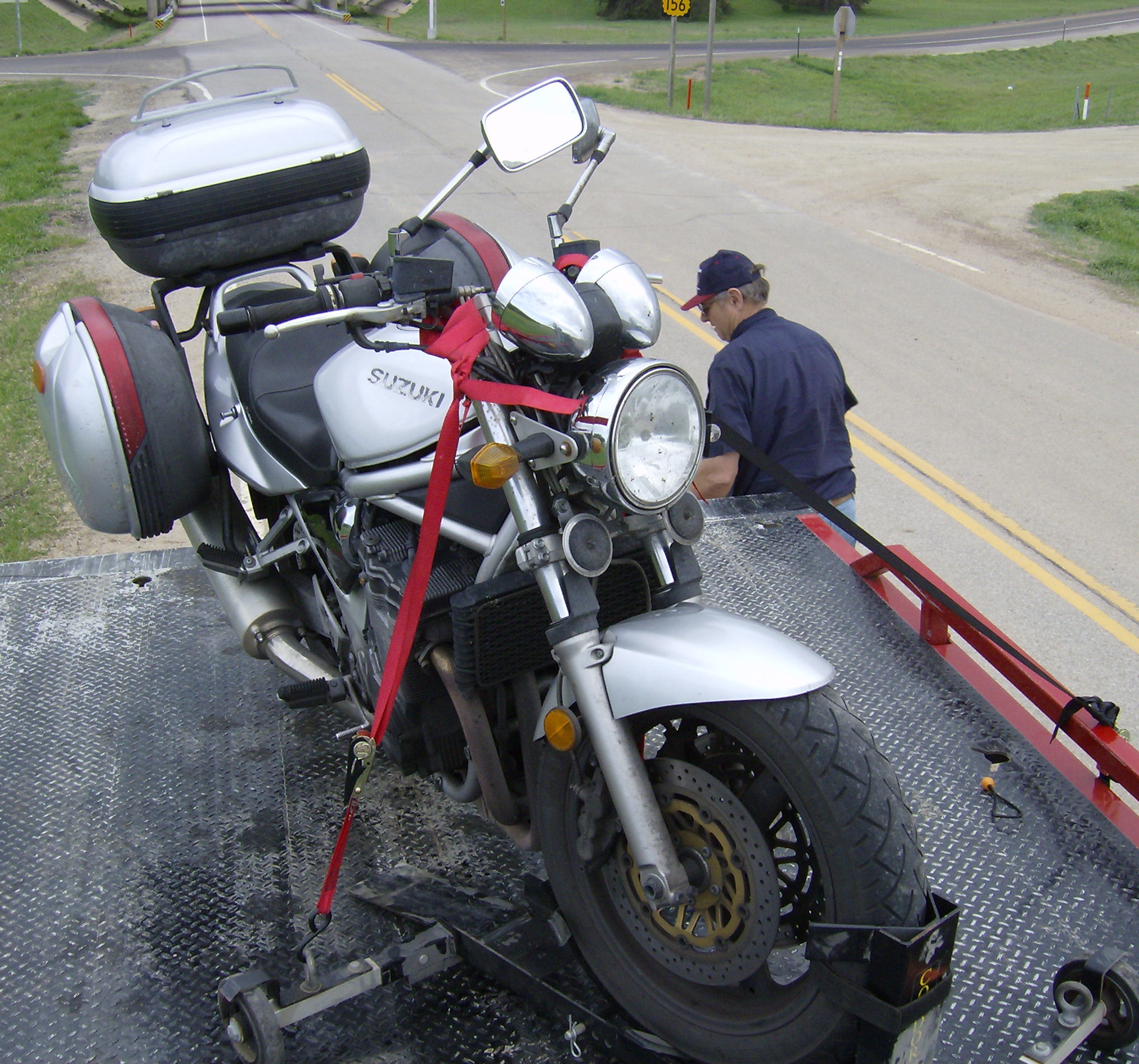 After my pizza was finished, he cut it and put it in a box for me. I thanked him and started the long, slow walk back to my bike. The timing was perfect; just as I was approaching my bike the tow truck was starting down the ramp towards it.