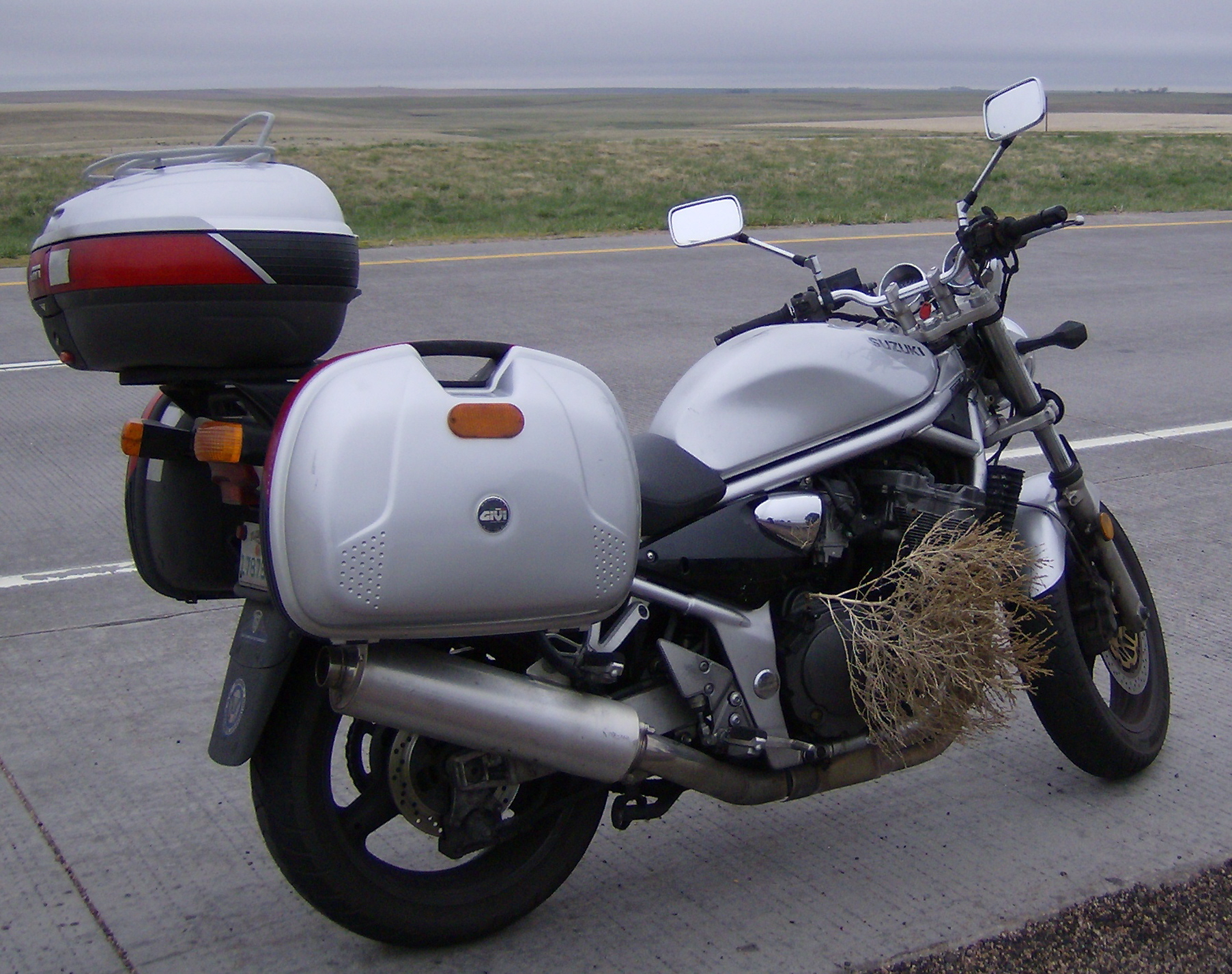 The weather was getting worse and worse as I continued across Kansas. Murderously stong prairie winds buffeted me from the side. I was banking as much as ten or fifteen degrees to the right just to keep going in a straight line down the Interstate. It was fairly unnerving, especially when a sudden gust would hit like a club, threatening to knock me right over, which at 70 MPH might not be fun. I had already been down once on this trip, and had no desire to repeat the experience any time soon. At least the pavement was level, hard and dry, I told myself. If it started to rain, I wasn't sure I'd be able to keep going with these winds.