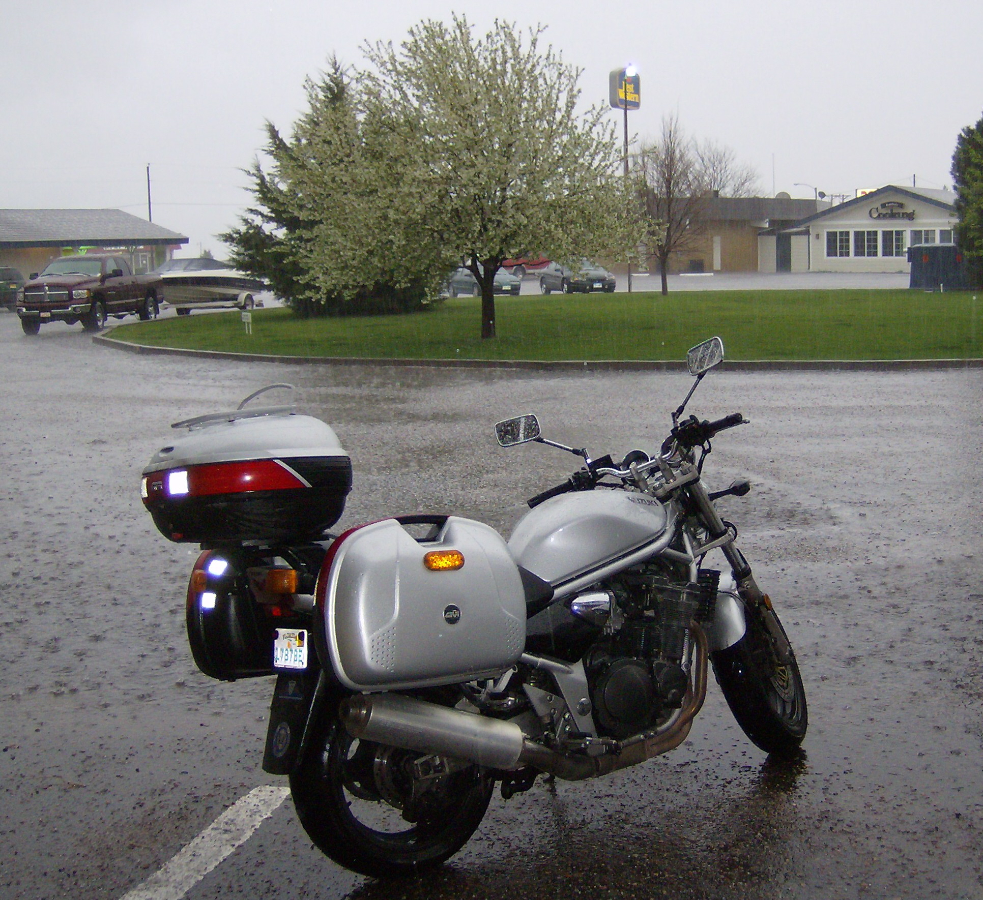 I did make it, and I pulled into the parking lot of the first motel I came to just as the rain began to come pounding down ferociously. As I was checking in, about a dozen other vehicles all pulled into the parking lot right behind me, all of them having the same idea. (No other motorcycles, though.)