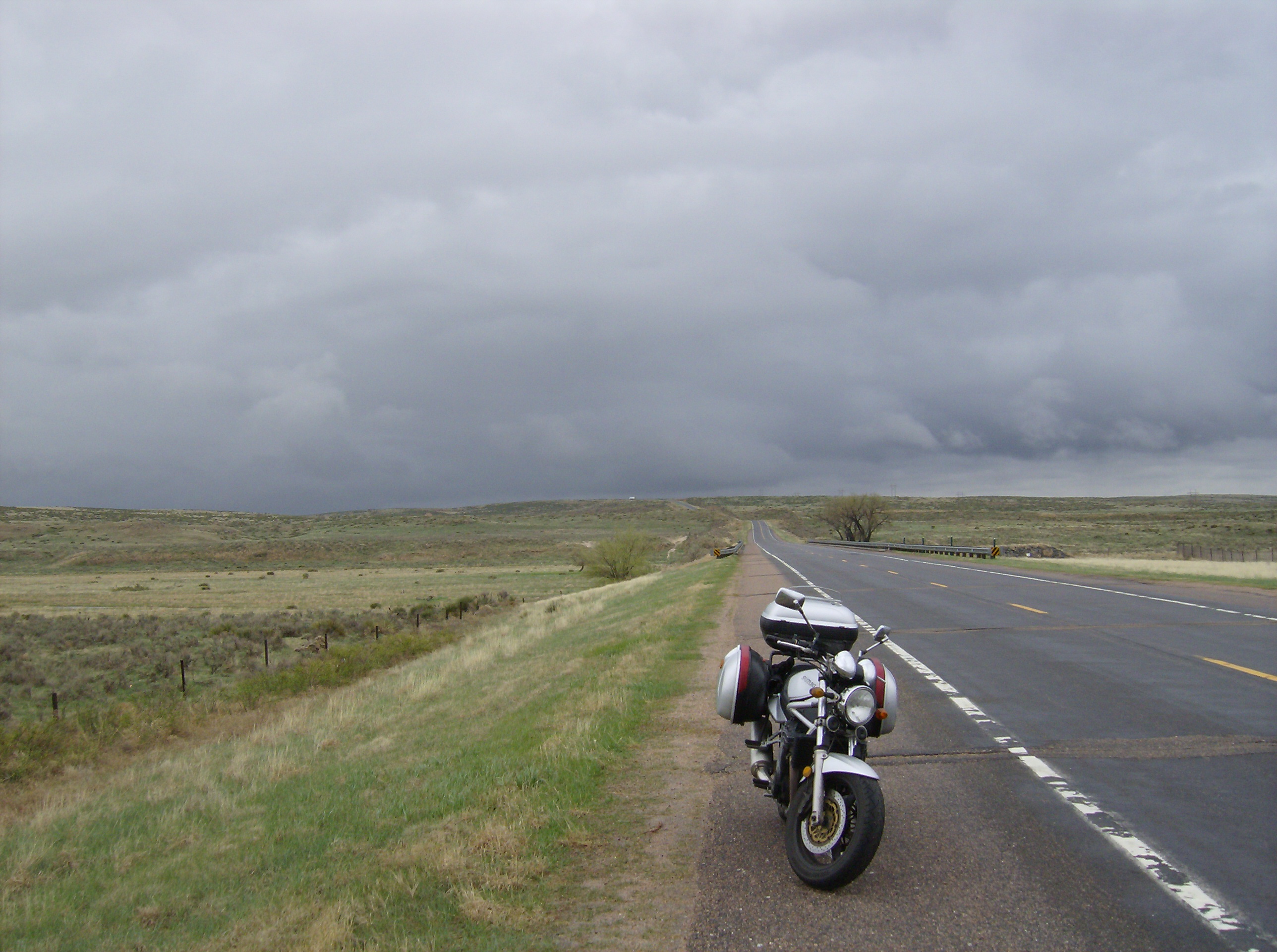 As I crossed into Colorado, rain began. I had originally hoped to make it most of the way to Montrose, but now I changed my mind and resolved to go only as far as Limon before stopping for the night. Things were starting to get ugly. Thunderstorms were popping up all around me, with frequent lightning. The wind was as fierce as ever, and it kept shearing to new and unexpected directions, leaving me fighting for control of the bike.