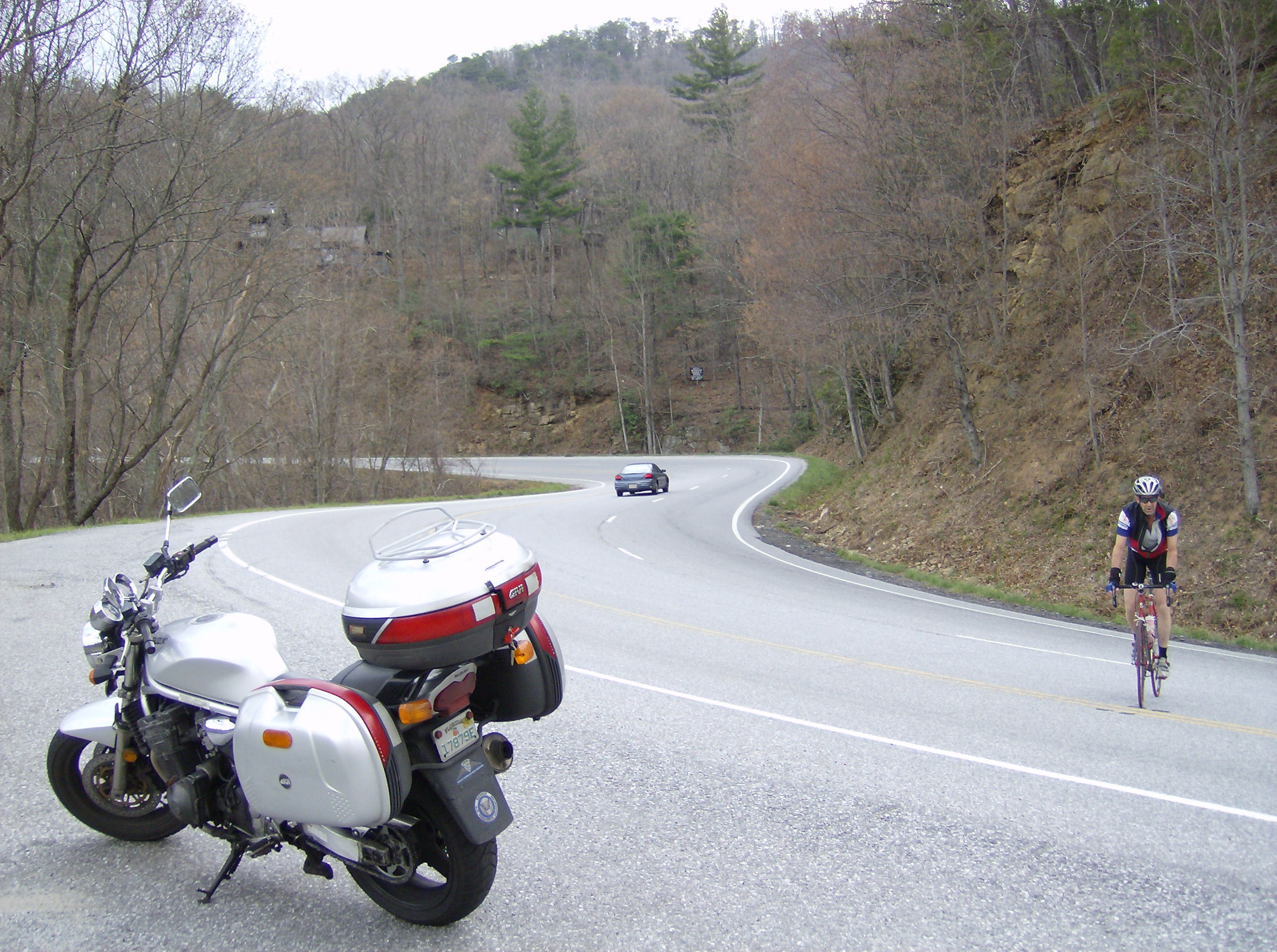 Proceding northbound on US 129 through the Georgia mountains on my way to the Two Wheels Only motorcycle resort, I often found myself sharing the road with bicyclists. Many of these roads were steep, narrow and treacherous -- I was impressed by these riders' physical stamina as well as their courage.