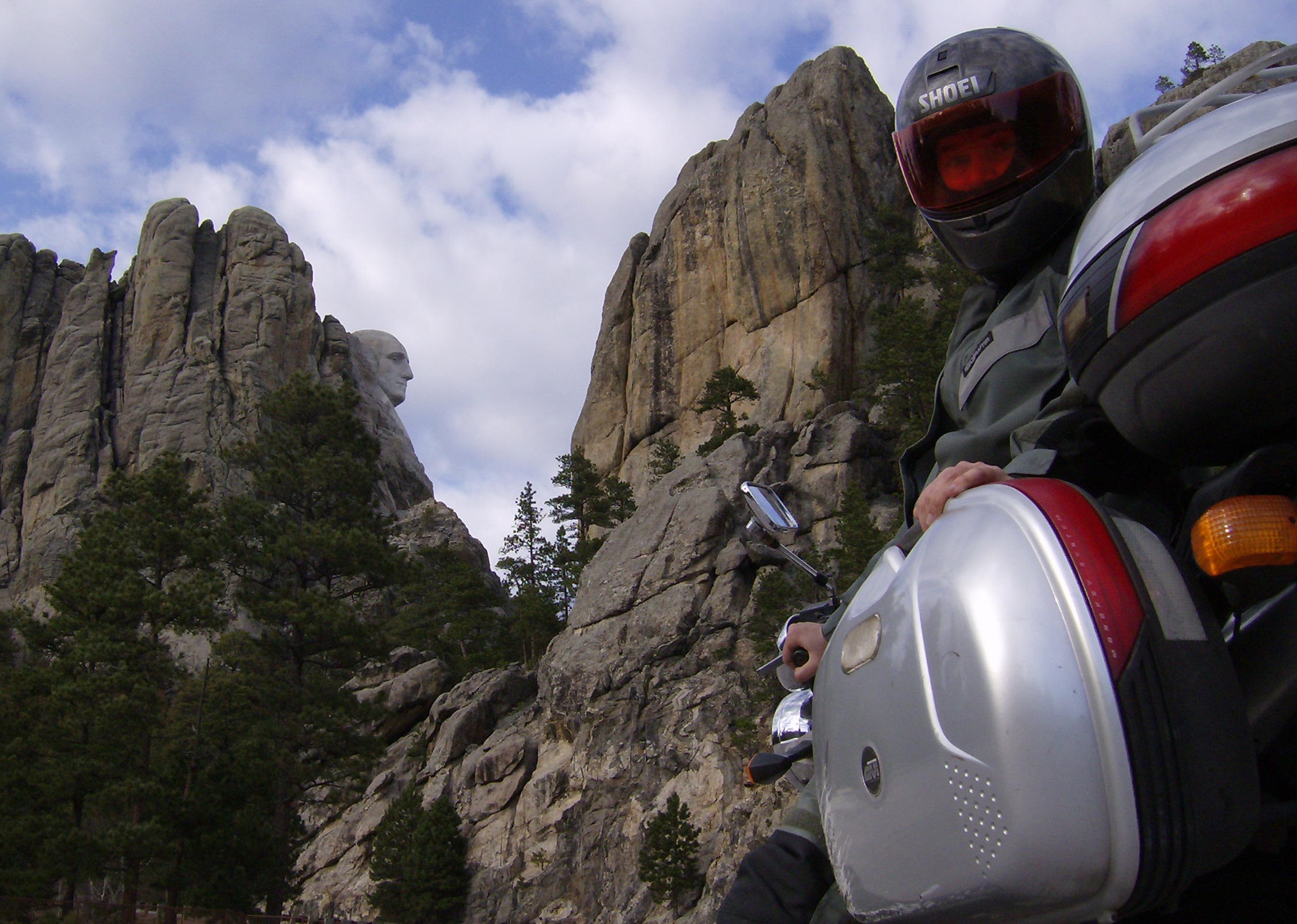 Hey, wait a minute. Is that a profile of George Washington up there? Yes, indeed. I really like this shot because it shows Mount Rushmore from a different perspective from what we're all so used to seeing. Also, it really captures the rugged natural beauty of the Black Hills, which would still be well worth a visit even if a fanatical KKK supporter hadn't desecrated a mountain the Sioux consider holy by carving the faces of four American presidents into it. This area really is spectacular, providing one awesome, breathtaking view after another as the road zigs, zags, loops and dips. Just watch out for the deer.