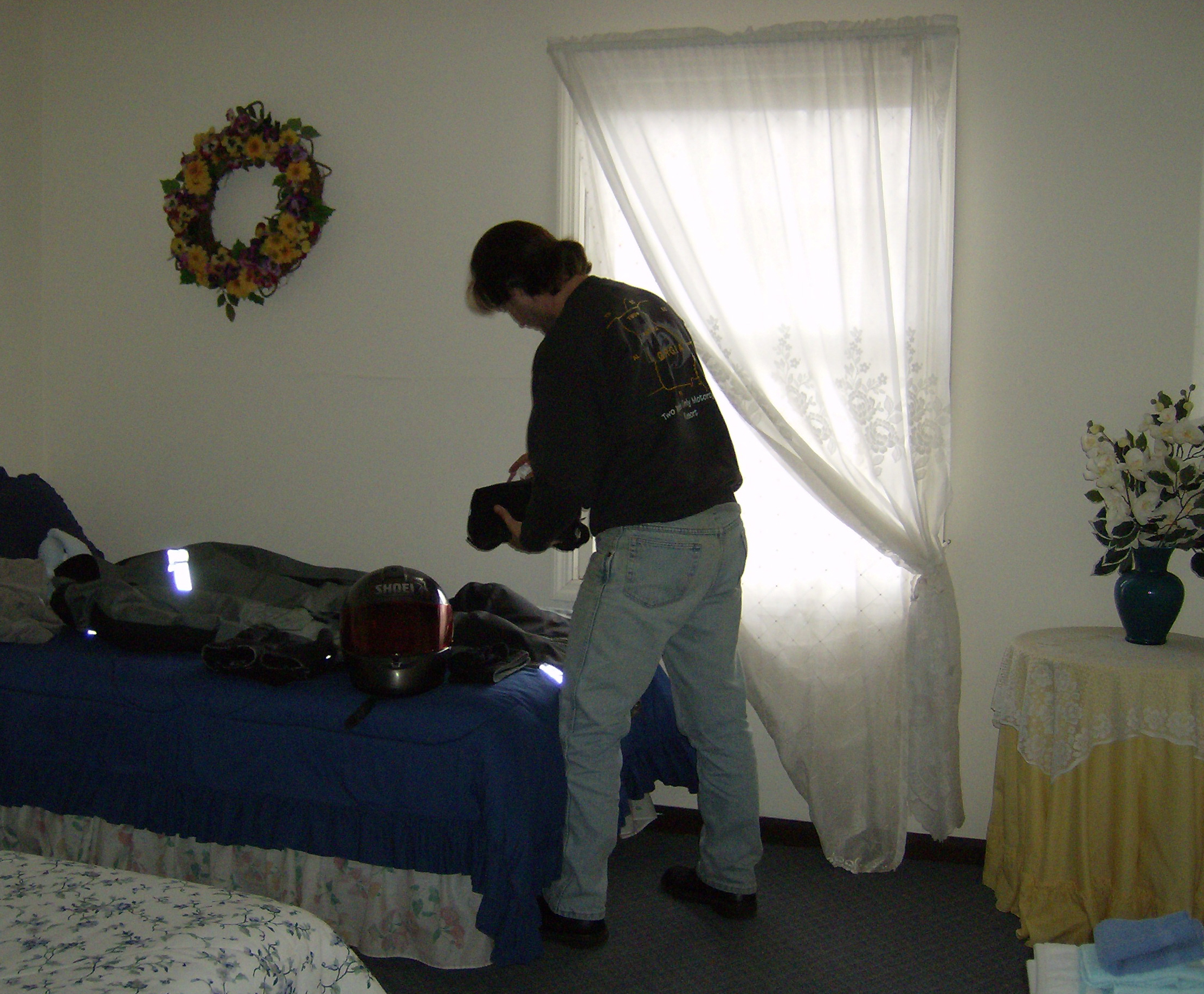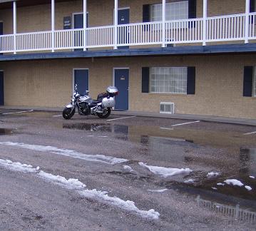 I ate a quick breakfast at the motel restaurant and then loaded up the bike. I put on every piece of clothing I owned, layering to the max and beyond. I knew that this would be a very, very cold ride for the first part of the day. One useful technique I have discovered is to travel with a pair of bluejeans that's about three sizes too big. That way, I can easily put on thermal underwear plus a pair of sweatpants under it. And then of course the riding suit goes over that for a total of four insulating layers to trap warm air.