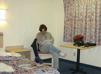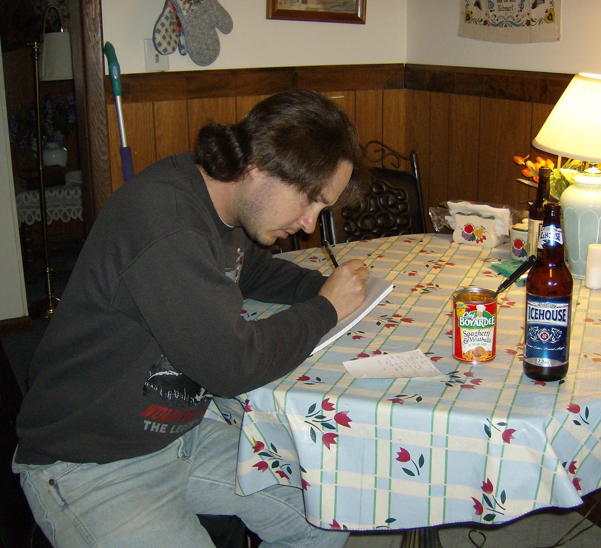 Updating notes in my travel journal (from which this account was later adapted) and eating dinner in the guest kitchen at Two Wheels Only. Dinner consisted of one can of Chef Boyardee Spaghetti & Meatballs and one 22-ounce bottle of Icehouse, which any writer or motorcyclist will tell you represents the perfect food-to-alcohol ratio.
