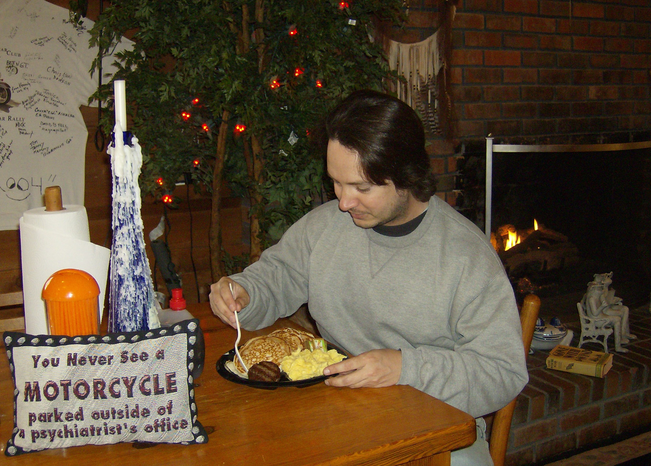 It was very quiet in there, almost eerie. The only sound came from the TV. They had CNN on. The Virginia Tech massacre had just happened, and it was all over the news. They hardly talked about anything else. A handful of other patrons, mostly truckers, were also in there, and a couple of them were reacting to what the reporters were saying. At one point a reporter said something about gun control and a trucker angrily yelled "that's not true!" at the screen. Another trucker asked our server, "Cherry," whether smoking was allowed. "Cherry" informed him that smoking was not allowed in any Florida restaurant. The trucker scowled and snorted that he was going to "scratch Florida off" his "list." I wondered if this meant he would never again accept jobs that took him to Florida, but I did not ask him for clarification.