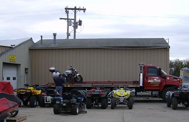 We arrived at Salina Powersports. They were kind enough to wait for us, staying open about twenty minutes later than their usual closing time. I talked to the man in the service department while the tow truck operator and one of the mechanics unloaded the bike. I explained that I wanted the absolute minimum repairs necessary to get the bike back on the road. I also told him about the twist in the steering. He said that someone would call me in the morning as soon as they'd had a chance to check it out.