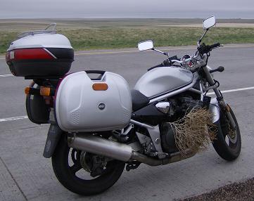 On most trips like this I find myself faced with the need for at least one improvised field repair. Once, for example, I was about 400 miles from home when the mounting hardware that secures the headlamp case to its bracket somehow managed to work its way loose and fell off, leaving the headlight hanging askew, shaking and wobbling. So I stopped, obtained a nut, bolt and washer of (approximately) the right size and reattached it. To this day, my headlamp case is slightly asymmetrical in its bracket: the non-original hardware is still on there on the left side.