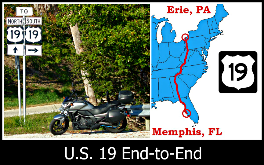 I have always been fascinated with the idea of riding a long highway all the way from one end to the other, and U.S. Route 19 seemed like an obvious choice, since it starts just a few miles from the marina where Salacia (the Island Packet 31 aboard which my wife and I live) is docked for the time being. So I took a week off and rode the entire length of it, hitting seven states on the way up, and adding an eighth (Maryland) taking different roads on the return trip. Here are a few of the highlights from the adventure.