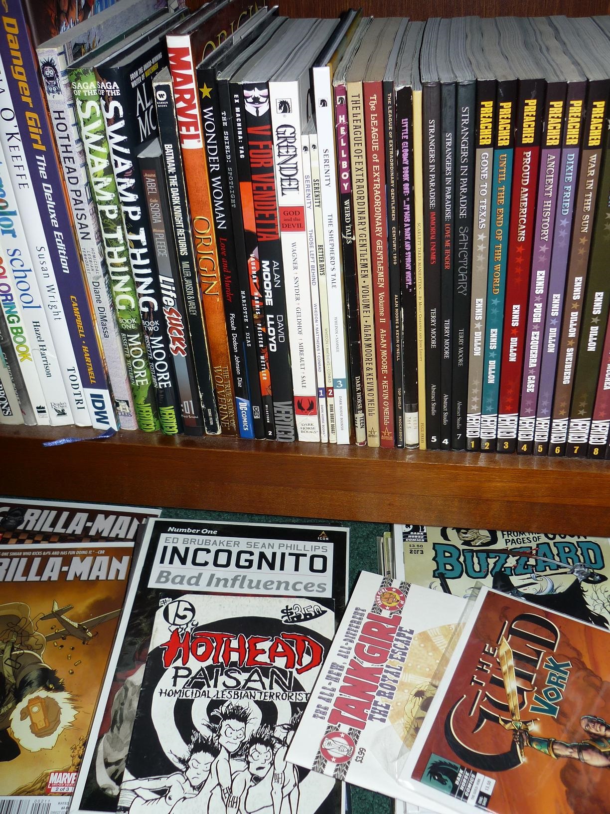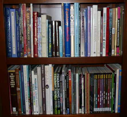 Our latest acquisitions -- many of which are school- or work-related, many more of which are decidedly not — are overflowing our existing shelving and it's time to seriously consider yet another bookcase . . . if we can figure out where to put it. This afternoon I separated and sorted some of Trish's most recent comic book purchases (below) and found space for them in the computer office.