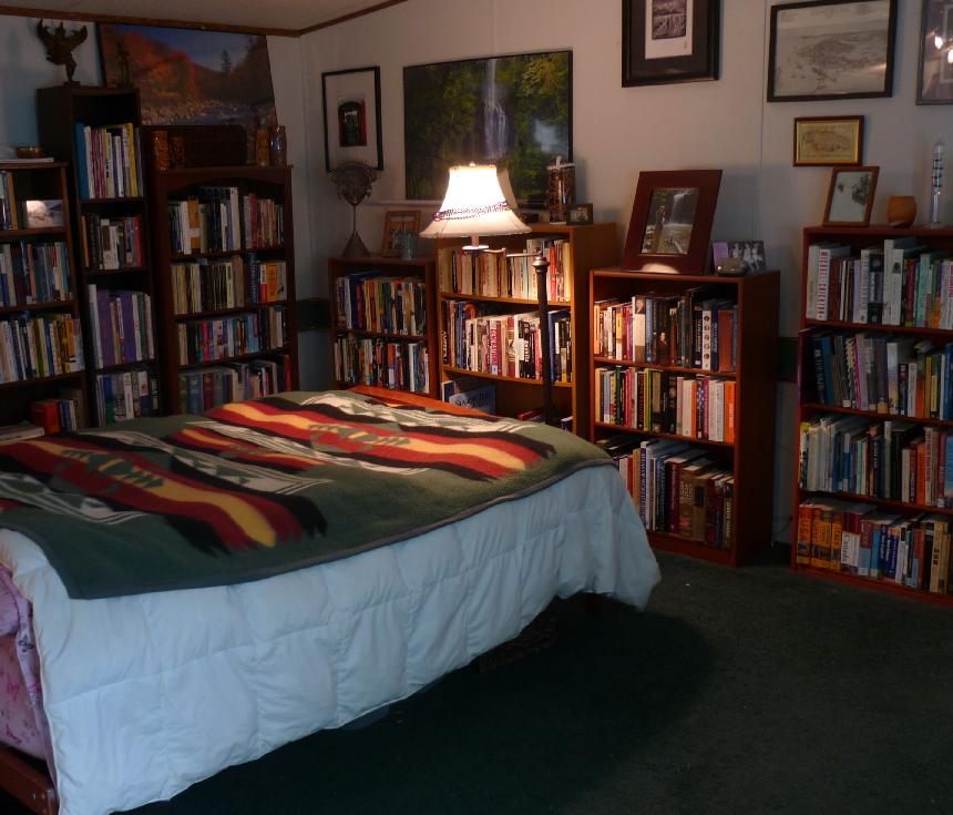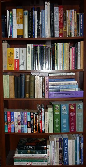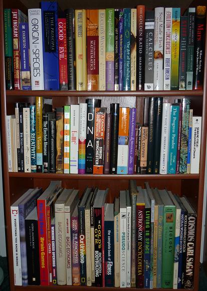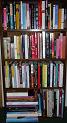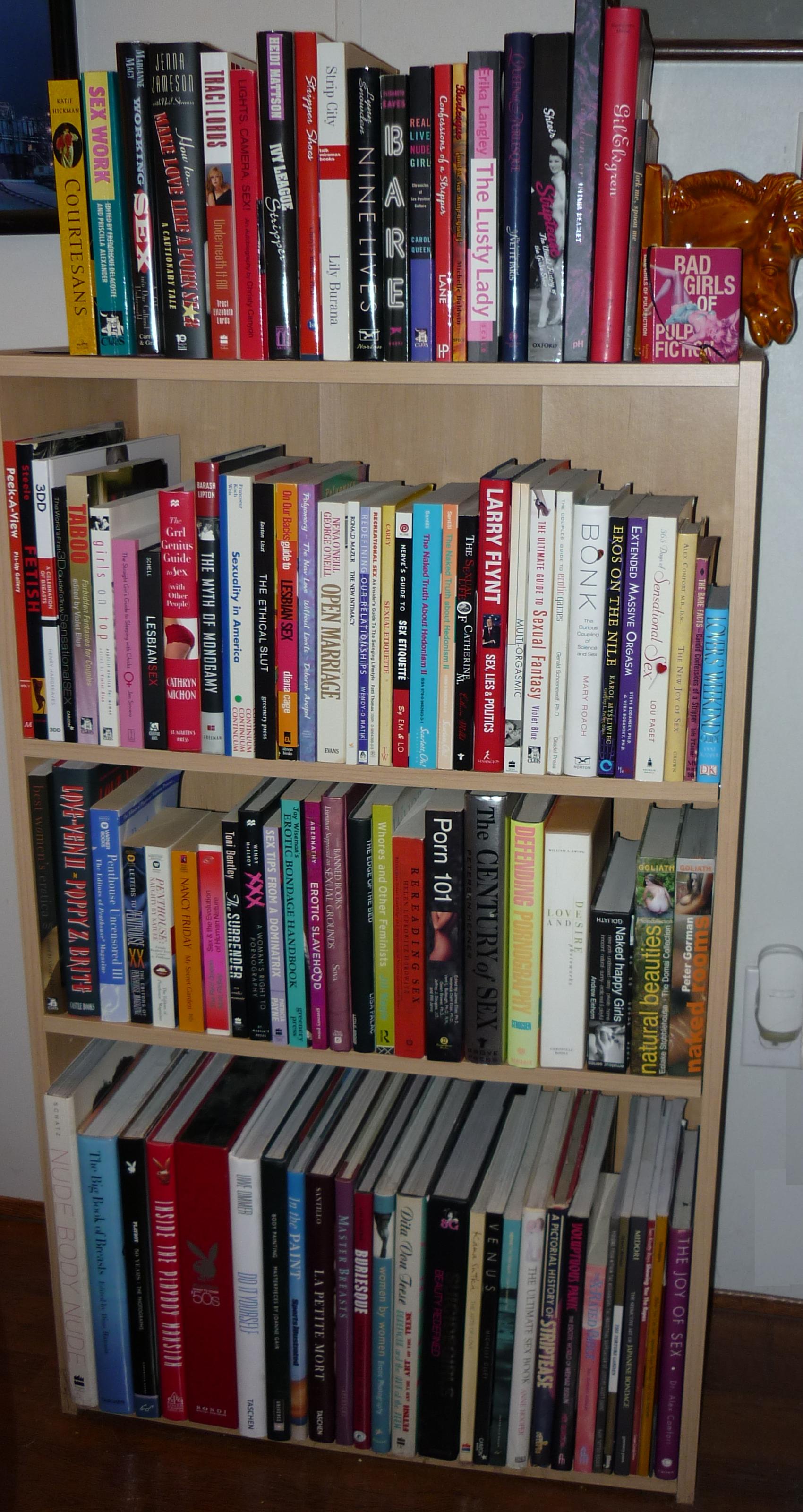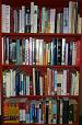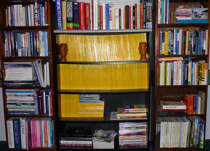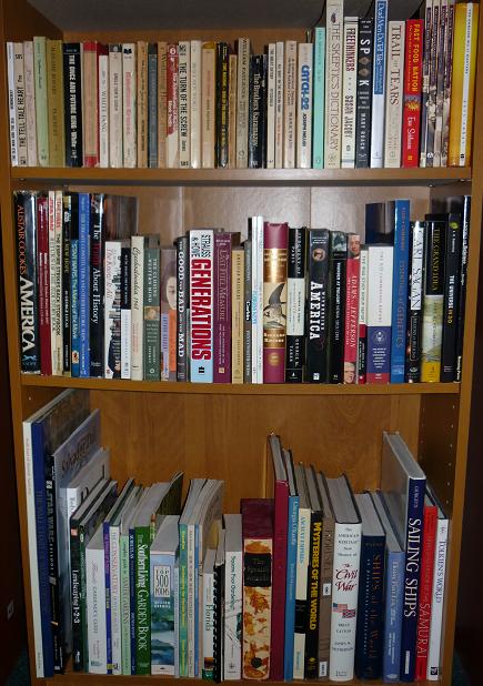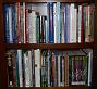 Neither of us ever set out to collect books or amass a library; it just sort of started to happen. Counting shelves and using averages, I estimate that we now probably have no less than 1,000 and no more than 2,000 books at this point (not including magazines), and the number keeps climbing despite the occasional reluctant purge.