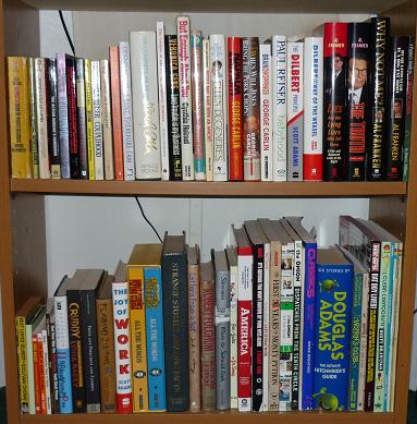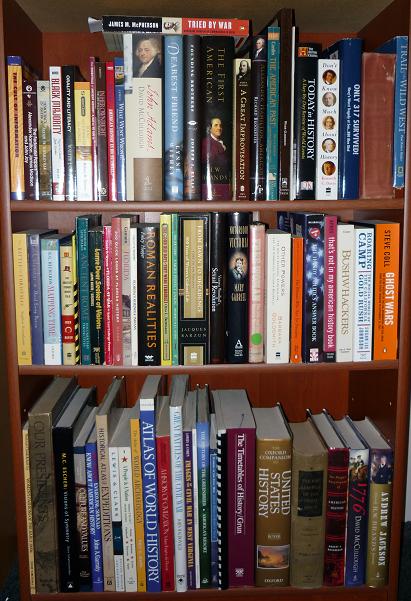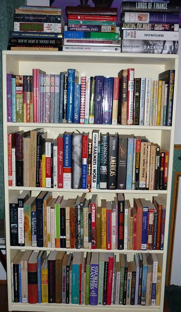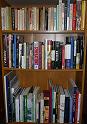 We have successfully completed moving all of Trish's books down to Florida and consolidating hers (maybe 300-ish of them) with mine (around 700-ish or so at the time). At that point they were all shelved and were mainly, that is to say, semi-mostly, sort-of, kind-of, largely organized by title, subject, author, theme and/or size. Size, ultimately, tends to be the biggest limiting factor. Often, they simply get put wherever we can find room. We did end up buying two new shelves; that helped clear some floor space.