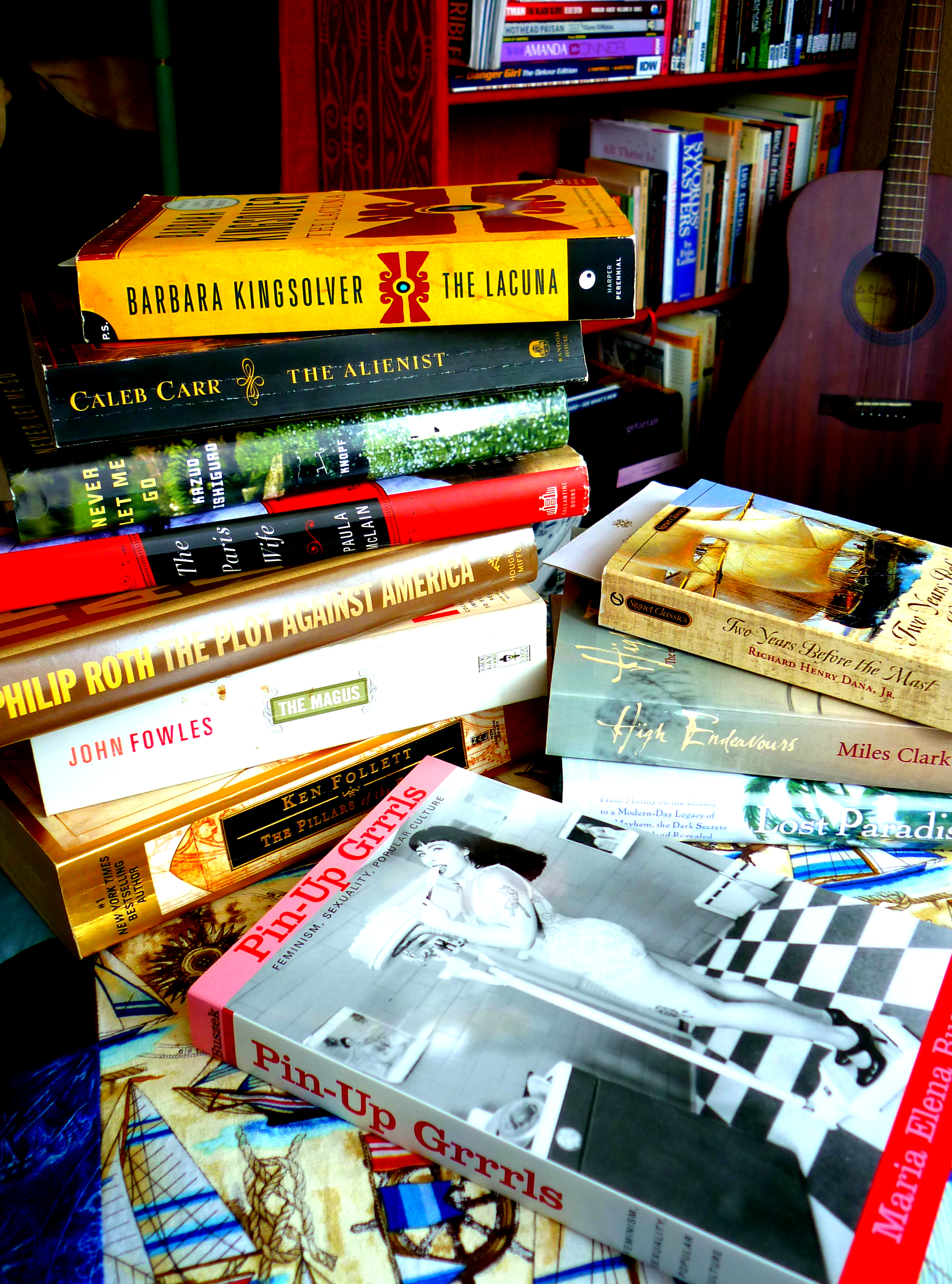 A few of the most recent additions to our household: on the left is Trish's currently-in-progress stack and on the right is my currently-in-progress stack. These include a number of books generously passed along to us by our wonderful (and equally bookishly inclined) friends Kristen and Bill. My most recent acquisition — which I picked up from the UPS Customer Center today, because they can't stuff boxes through the mail slot of our new home, a second-story walkup apartment in St. Petersburg — is titled Pin-Up Grrrls: Feminism, Sexuality, Popular Culture by Maria Elena Buszek, an assistant professor of art history at the Kansas City Institute. I just started it a few minutes ago, but I can already tell you it's pretty interesting, quite educational and very well researched.