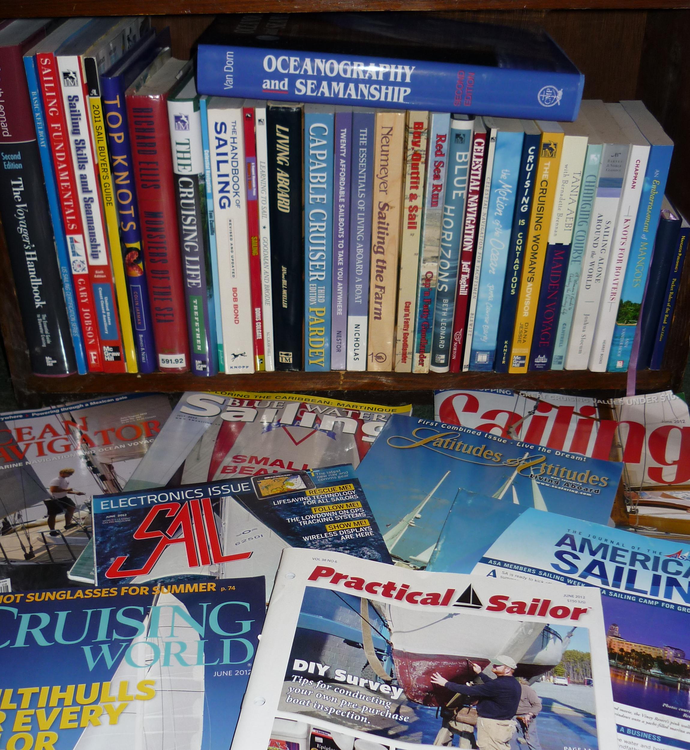 The result of our most recent attempt at organizing our collection, this is our latest dedicated shelf, containing all our sailing books, with some of our sailing-related magazine subscriptions spread out below it: