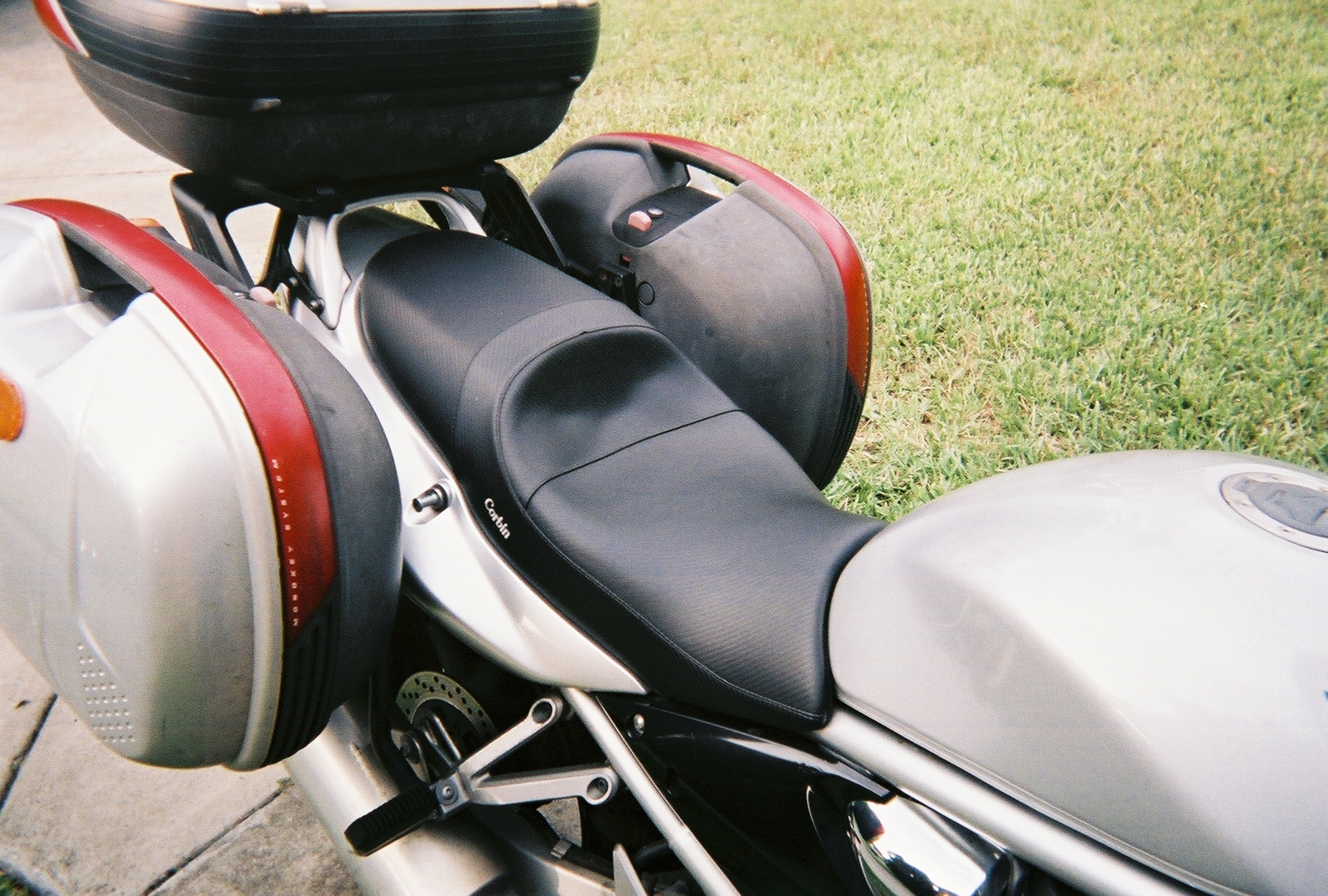 You basically need two things to make a motorcycle into a touring bike: luggage and a comfortable seat. This is my very nice Corbin saddle, which easily adds a couple hundred miles to my riding day. Note the scooped-out, "bucket" shape. Not cheap, but worth every penny on a long trip.
