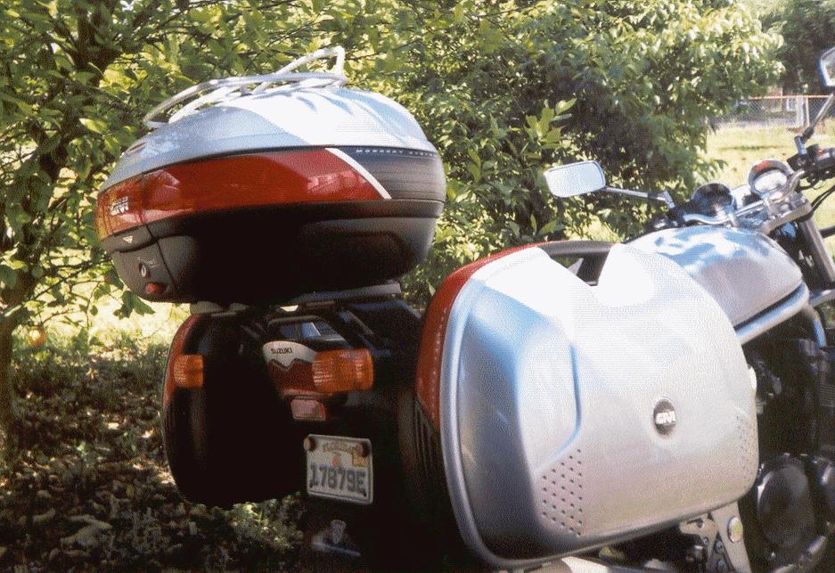 The addition of a set of lockable, removable Givi hardcases transformed Pancho into a sport touring bike with more storage area than a freakin' Gold Wing, man! The top case (a Maxia E52) has about 50 liters of storage capacity, enough to hold two full-face helmets next to each other. The side cases (a pair of E360s) have about 40 liters of additional storage capacity each, for a total of around 130 liters. Plus the top case has a luggage rack to secure even more stuff. I can easily pack enough gear for a week-long expedition . . . and I often do.