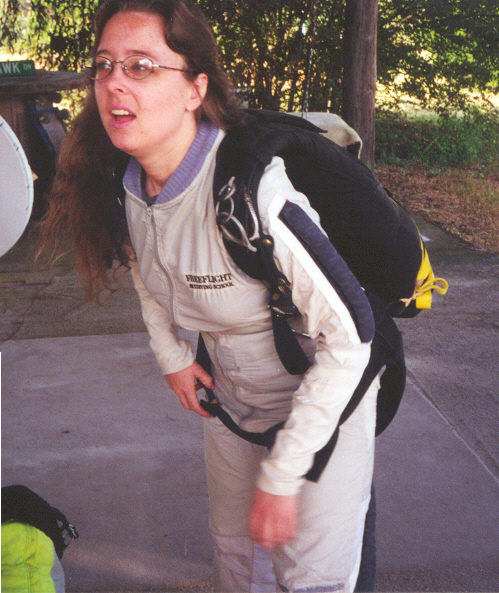 As she shrugged the rig up onto her shoulders, tightened her harness straps and grimmaced, we explained that student gear is much bulkier and more unwieldy than the smaller, lighter gear used by experienced skydivers. "I hope so," she muttered.