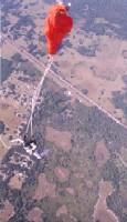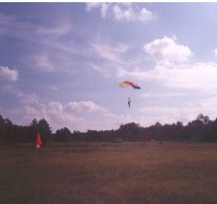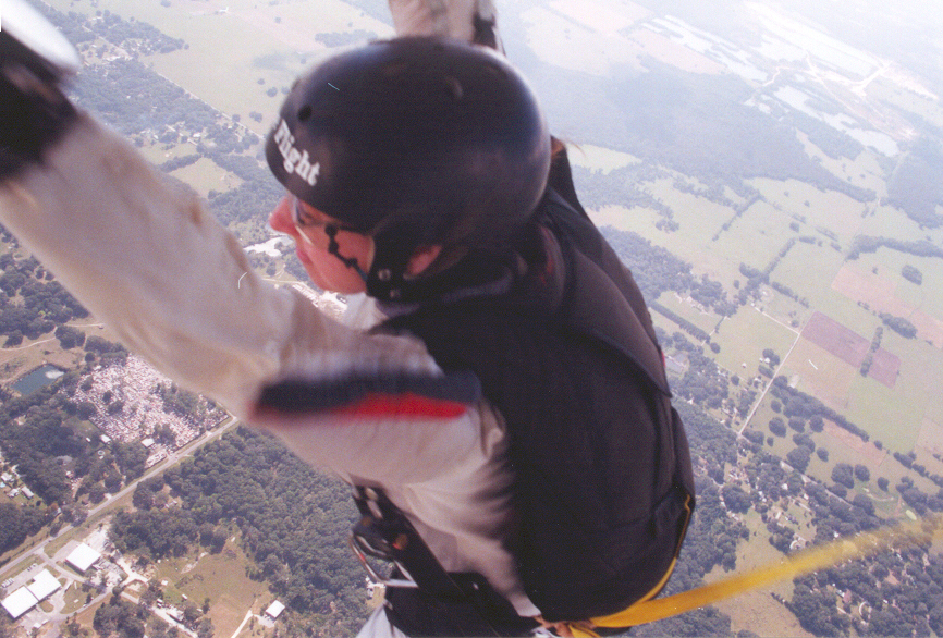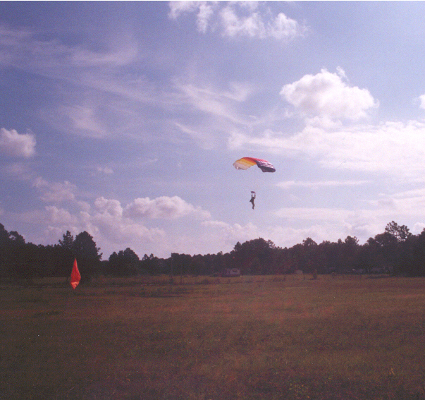 "Go!" Her main canopy, a Falcon 235, emerges cleanly from the deployment bag about one second after she exits. The time she spent practicing in the SkyVenture Orlando vertical wind tunnel really paid off -- her body position was almost perfect. If you look carefully, you can see FreeFlight's 4,200-foot turf runway in the background. It runs parallel to the railroad tracks. The square field at the upper left of this photo adjacent to the southern end of the runway is the drop zone's landing area.