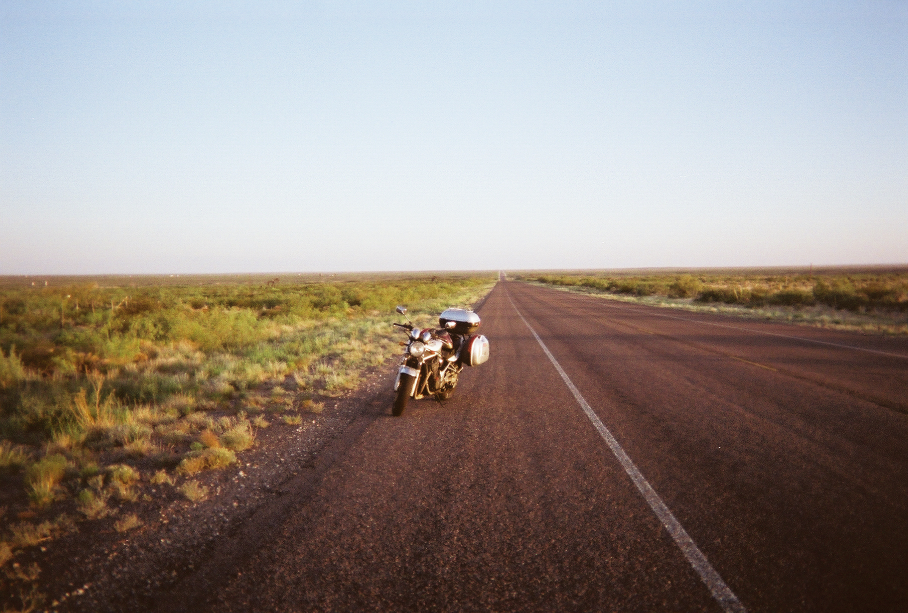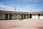 Here you can see Pancho parked in front of the Shaffer Hotel and Restaurant in Mountainair, New Mexico, where I had lunch. The Art Deco building was put up in 1923 by Clem "Pop" Shaffer. (No, those aren't Nazi swastikas on the front -- they're indian designs.) I love stopping at places like this to eat when I'm on the road. Check out their web site for more.